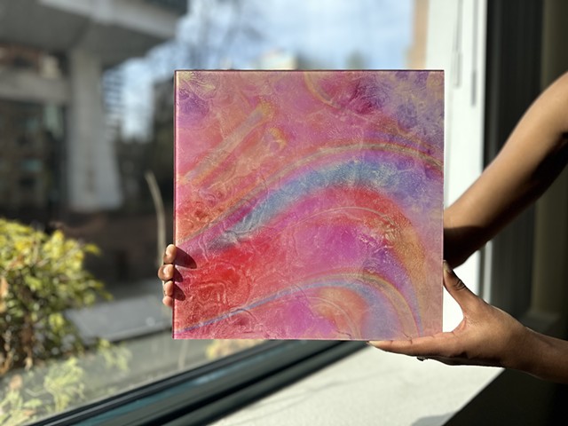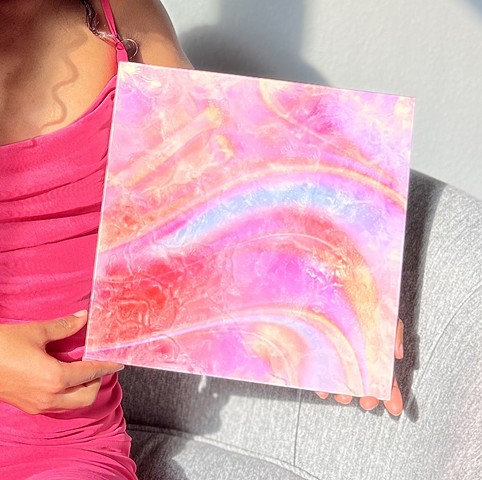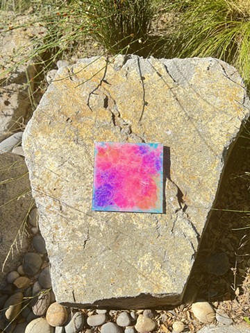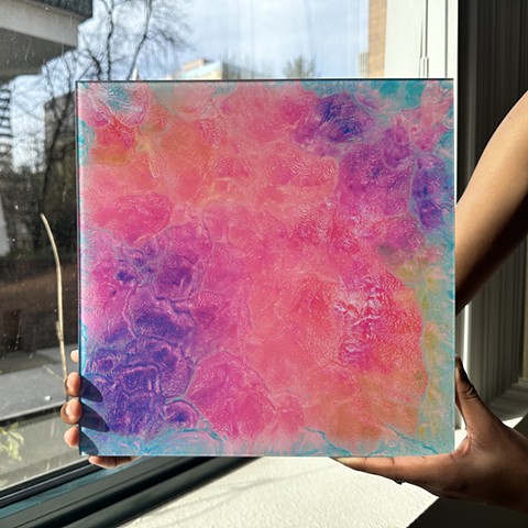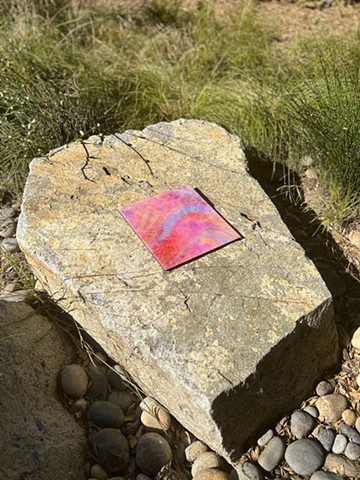 These flat hanging sculptures are composed of glass tinted with inks. First they are composed as a three dimensional (3D) plane with simulated lights, colors, and an assemblage of images are mapped onto this "object." This rendering in 3D informs the appearance of the real life object which takes on new life as a glass material.